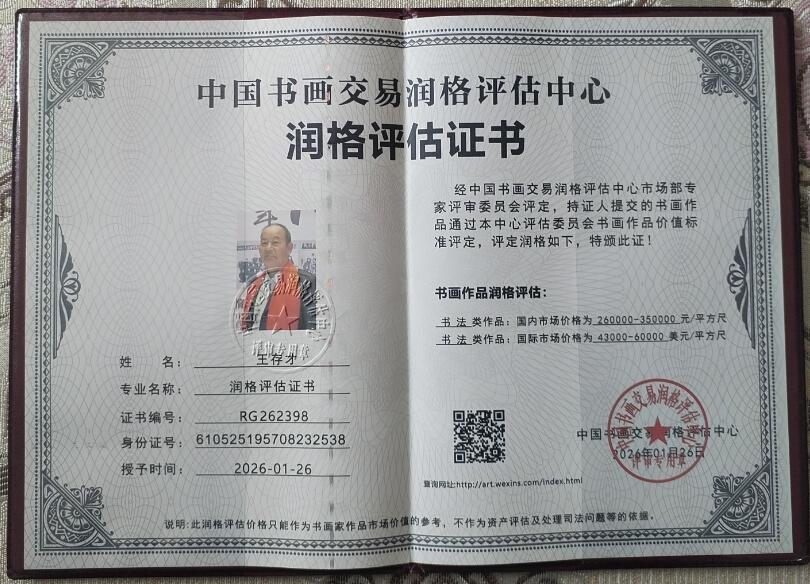 喜讯:经中国书画交易润格评估中心润格评估,王存才书法作品国内市场:26万元至35万元/平方尺,国际市场:4.3万美元至6万美元/平方尺。【特别备注:本作品参考润格由中国书画交易润格评估中心出具,仅作为市场宣传参考价,不代表实际成交价格,不具备法律与官方评估效力。】