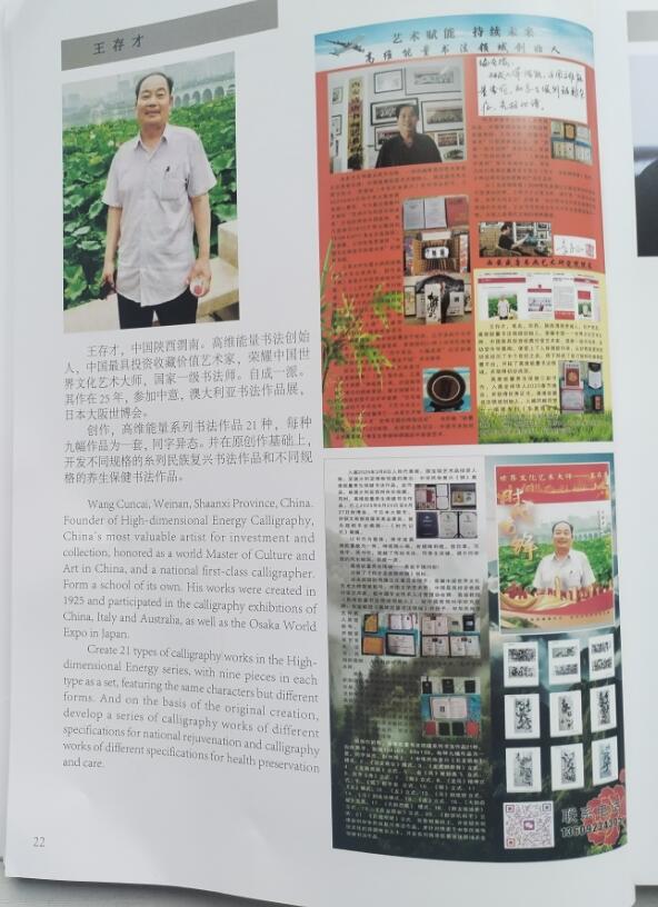 该书刊精选了王存才书法老师创作的高维能量系列书法作品21种,每种九幅作品为一套,同字异态。并在原创作基础上,开发不同规格的系列民族复兴书法作品和不同规格的养生保健书法作品,面向全球发行。