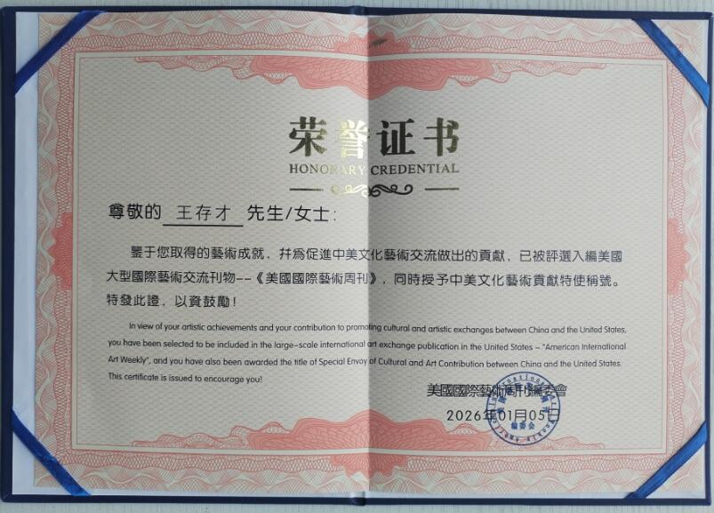 特大喜讯:2026年1月5日,高维能量书法领域创始人,民间祈福师、人体潜能疗养师、国学文化传承师、笔杆子风水师、中国书法协会会员<香港>。中国翰林书画院院士 。中国书画家协会常务理事。艺术家职称评定委员会 , 一级书法师。北京润墨斋书画院院士。北京秦韵源书画院会员。北京曲风书画院会员。西安盛唐书画艺术研究院理事。王存才书法老师入编《美国国际艺术周刊推荐艺术家作品集》第七期,并获美国国际艺术周刊编委会颁发的荣誉证书。